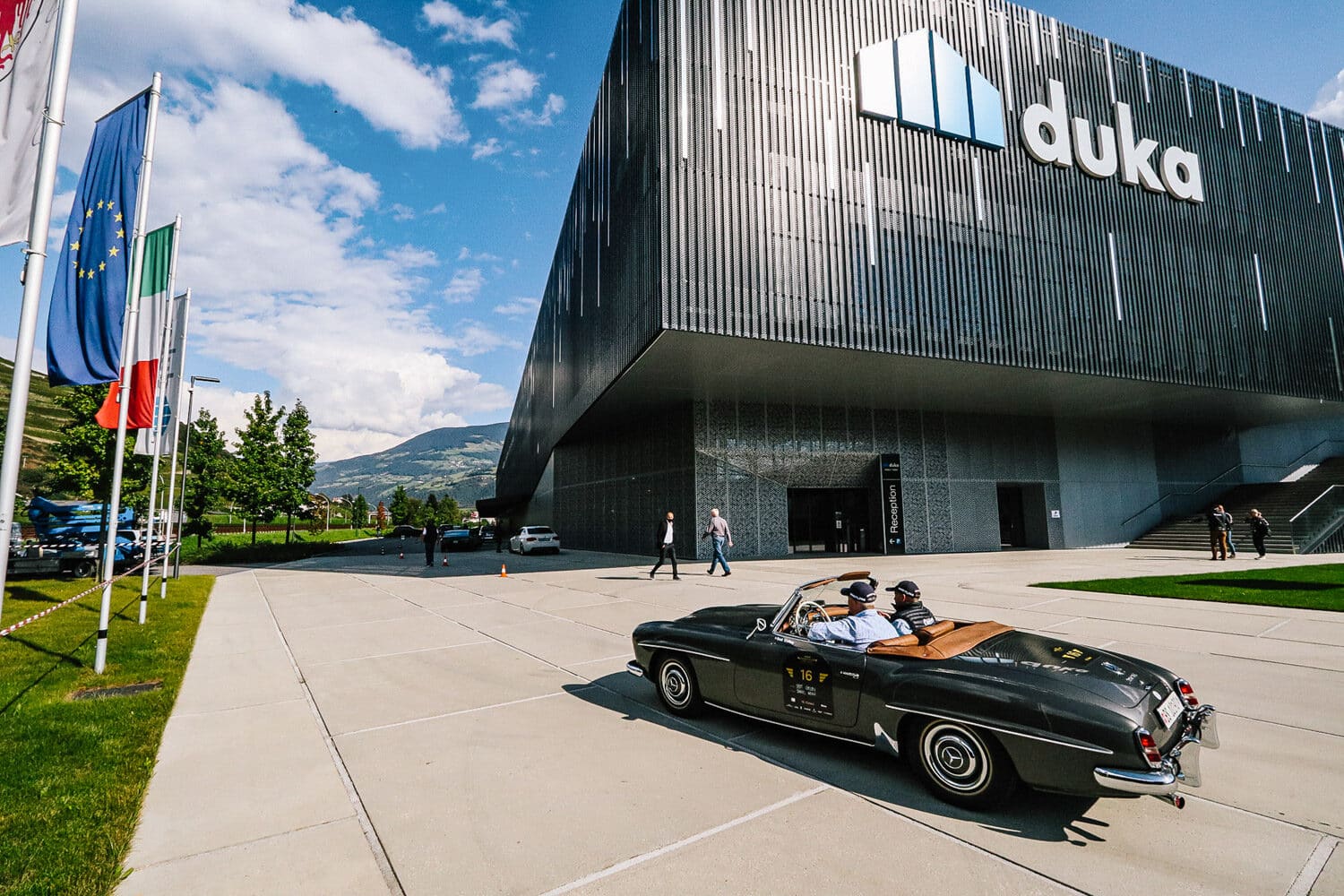 Wer nach dem Traumtag am Freitag dachte, es gäbe keine Steigerung mehr, wurde am Schlusstag eines Besseren belehrt. Auf dem Penser Joch packte das Waldhorn-Team um Daniel Wenk und Beat Voellmy plötzlich ein Alphorn aus – ein Mordstrumm, das sich aber, weil es aus Carbon ist, einfach ineinander schieben und im Kofferraum verstauen lässt. Nach der spektakulären Stadtdurchfahrt in Sterzing pilgerte der Oldtimertross in den Wallfahrstort Maria Trens zur Mittagspause im Gasthof Post, um danach ganz weltlich beim Duschkabinenhersteller duka eine anspruchsvolle Prüfung auf dem weitläufigen Firmengelände abzuhalten.