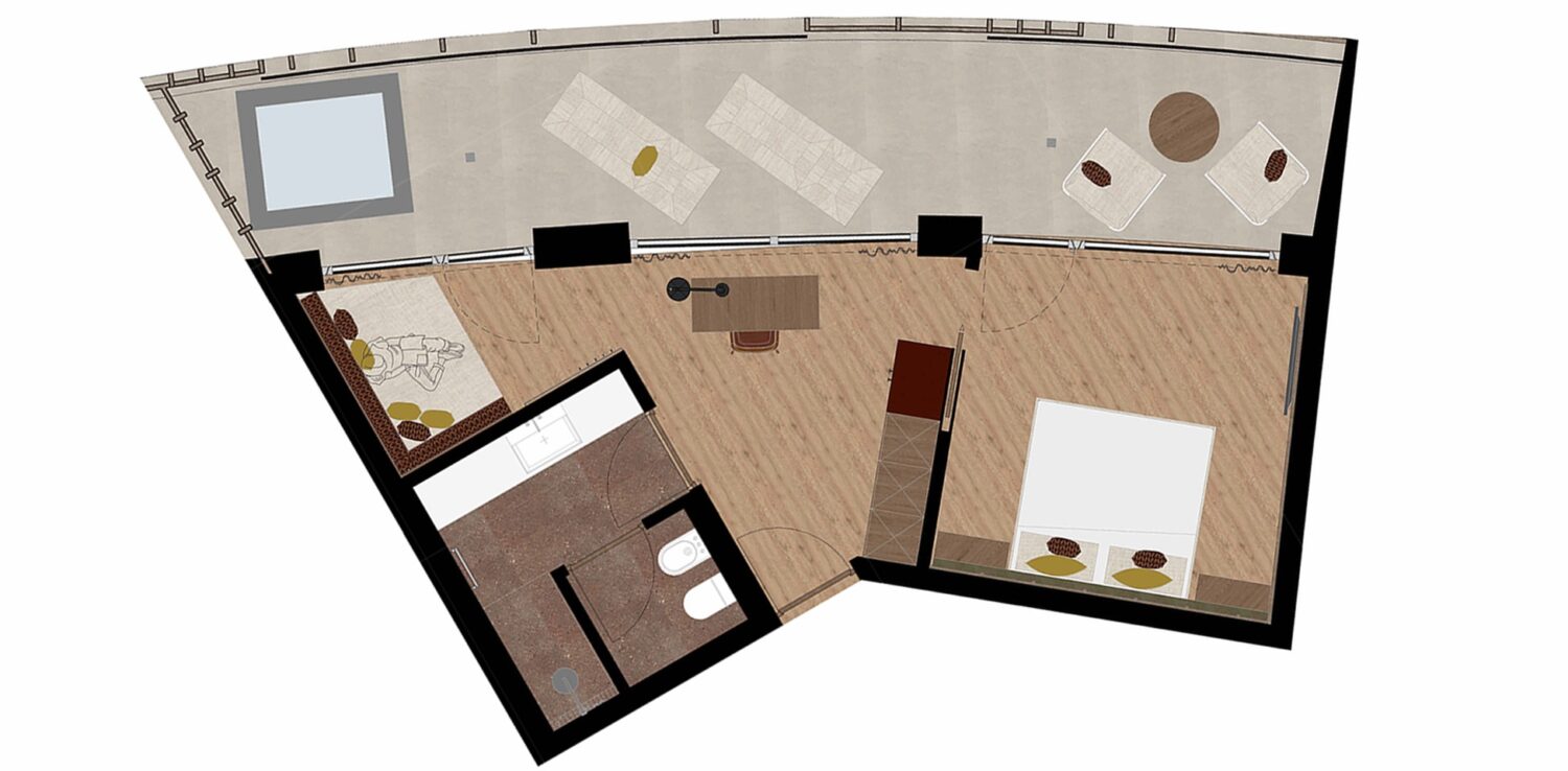 Die 27 m² große Terrasse mit privatem Außenwhirlpool eröffnet eindrucksvolle Ausblicke auf die Bergwelt und macht diese Suite zu einem besonderen Rückzugsort. Hochwertige Naturmaterialien, warme Holztöne und fein abgestimmte Stoffe prägen die ruhige, zeitlose Gestaltung.
